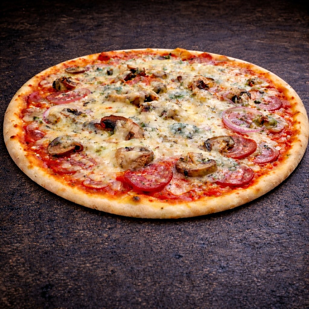 Tomatová omáčka, suchý salám, niva, žampiony, sýr gouda, oregano