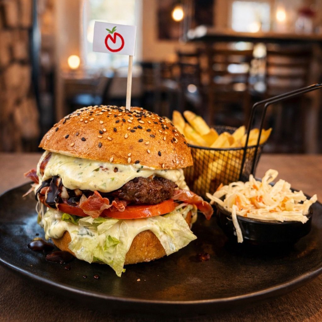 hovězí mleté, slaát, mozzarella, rajčata, parmská, bazalková mayo, krémové balzamico